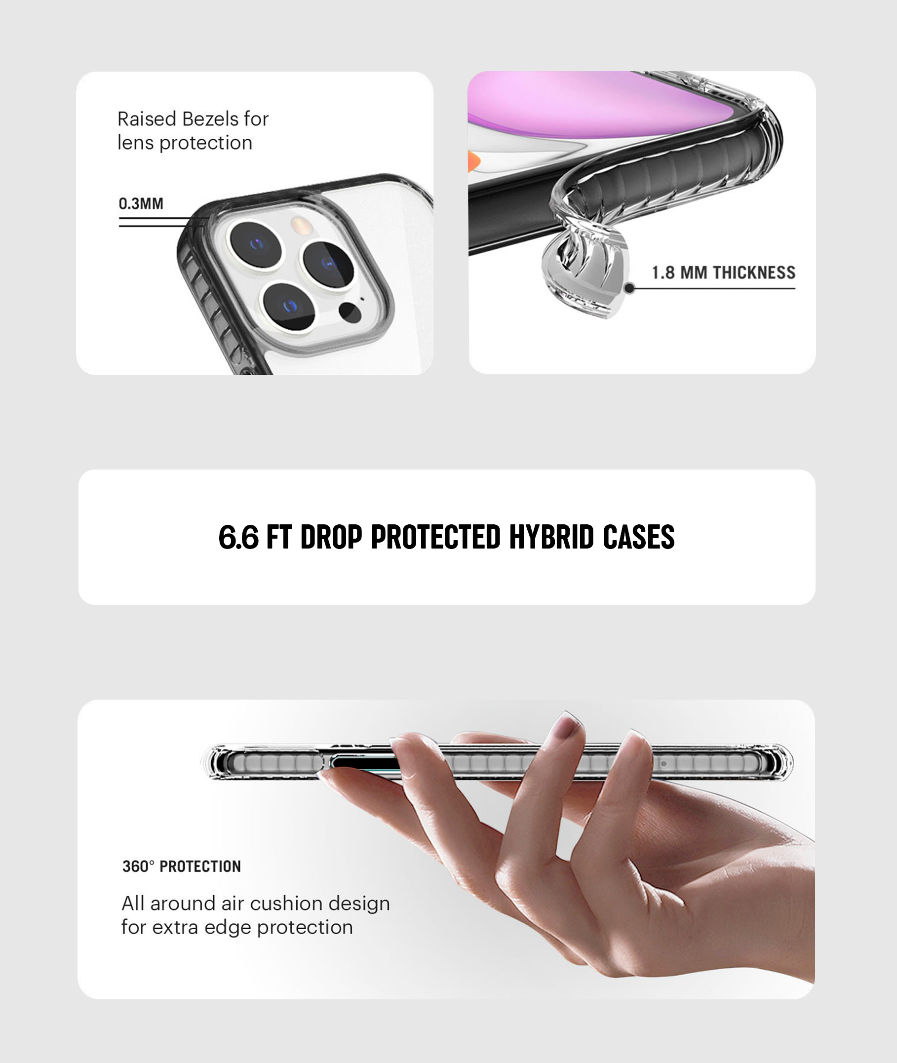 DESIGN - HYBRID CLEAR DESIGN WITH HARD PC MATERIAL ON BACK AND 1.8MM TPU FRAME FOR BETTER GRIP